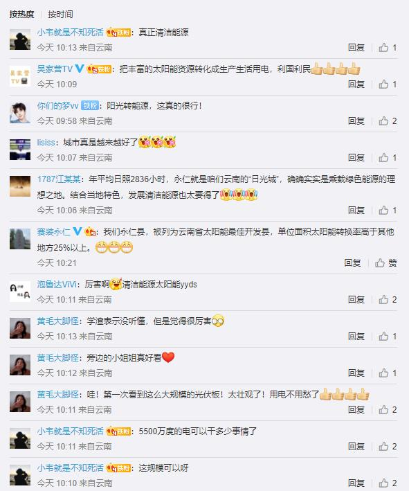 据统计,本场直播观看量达201万,直播相关资讯全网阅读量1166万。在微博平台直播中,网友们积极留言互动,“把丰富的太阳能资源转化成生产生活用电,利国利民”“阳光转能源,这真的很行!”“年平均日照2836小时,永仁就是咱们云南的“日光城”,确确实实是乘载绿色能源的理想之地。结合当地特色,发展清洁能源也太要得了”“哇!第一次看到这么大规模的光伏板!太壮观了!用电不用愁了”“5500万度的电可以干多少事情了”“我们永仁县,被列为云南省太阳能最佳开发县,单位面积太阳能转换率高于其他地方25%以上。”