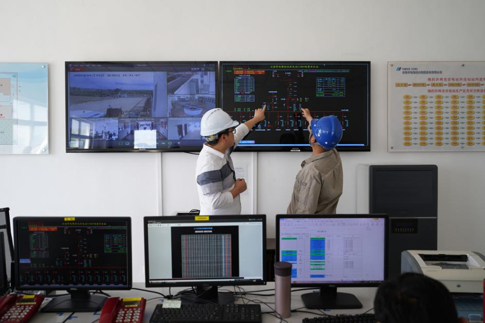 穿过公司电站的前院,直播团队来到了电站的“中枢大脑”——中控室,这就是把漫山遍野的光伏板收集到的太阳能转化成电能的地方。在这里,我们见到了永仁华电新能源开发有限公司维的光伏电站值长张云军。张云军是有着30多年从业经验的老工程师,从业期间辗转省内外多个光伏电站,积累了丰富的工作经验。张云军向大家展示了光伏电站的智能控制系统,在中控室的电脑和屏幕上有许多不同的数据和各色的线路图,它们就是阳光一步步经过集合、裂变、升压、降压等一系列转化后变成生产生活用电过程的证明。几千亩的光伏电站,却只有寥寥几个人即可完成几千万甚至上亿千瓦的电流转化,得益于公司引进的智能控制系统。在电脑屏幕前几个操作步骤,即可通过电流电压反应知道线路是否正常通畅,各个节点是否正常运转,极大地降低了电力工人工作强度。