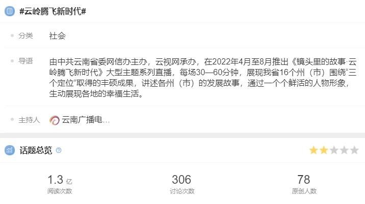 截至目前,本场直播观看量超过181万,本场直播全网阅读量达到1290.9万,系列直播相关资讯全网阅读量超过1.6亿。其中,“云岭腾飞新时代”相关话题阅读量累计超过1.4亿。针对“云岭腾飞新时代”系列直播,云视网还推出海报、宣传片、图文预告、短视频、网评等多种新媒体产品,在传统媒体、新媒体平台亮相。截至目前,《镜头里的故事·云岭腾飞新时代》已完成昆明、玉溪、楚雄、普洱、西双版纳、大理、丽江、临沧、怒江、保山、迪庆11地直播。