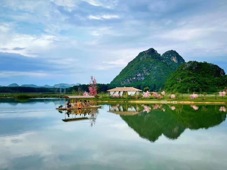 如今,普者黑景区引入建设了科技旅游、农旅融合、亲子研学等旅游新业态。例如,游客可以在“水陌青田”看到传统的农耕业态,亲身体验农村生活方式,也能带着老人和孩子到“兔耳朵农庄”在玫瑰田体验传统非遗手工制作。
