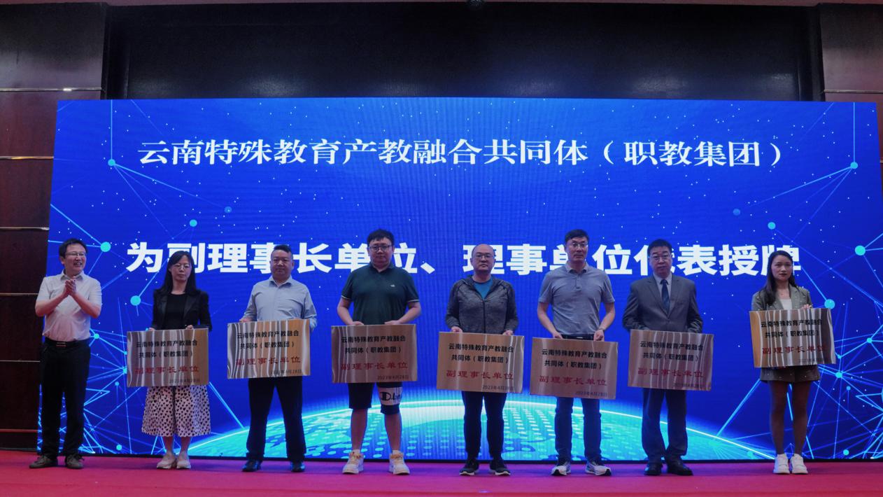会上,云南特殊教育职业学院党委书记孙继先发起云南成立特殊教育产教融合共同体(职教集团)倡议并揭牌。会议宣布了共同体第一届理事会成员,理事长、副理事长、常务理事、理事单位名单,并为相关单位和专家委员会委员代表授牌。