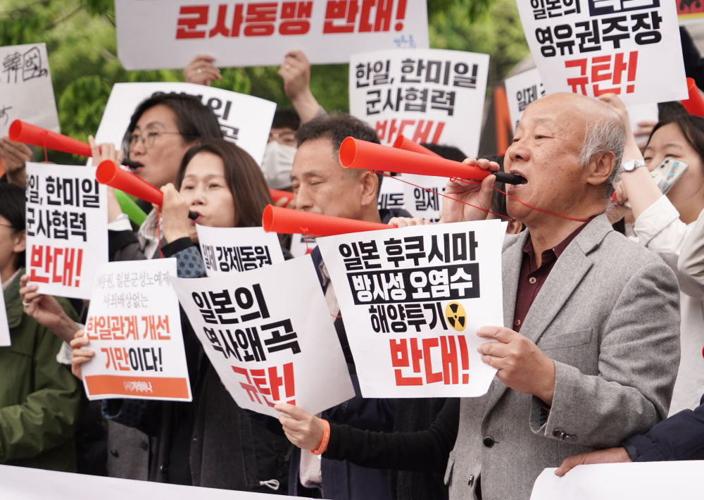 在韩国总统府前的集会现场,民众手持“停止构建韩美日同盟”“停止对日屈辱外交”“立即撤回核污染水排海计划”等标语。他们要求日本政府对二战期间的殖民统治进行道歉并给予赔偿,强烈呼吁停止扩大韩美日三方军事合作,共同维护地区和平稳定。