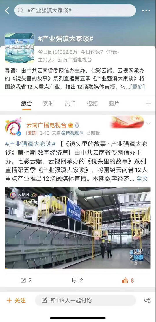 据统计,本场直播观看量达263万,直播相关资讯全网阅读量超过1315万。其中,“产业强滇大家谈”微博单日新增1052.6万。针对“产业强滇大家谈”系列直播,云视网推出了海报、宣传片、图文预告、短视频、网评等多种新媒体产品,在传统媒体、新媒体平台亮相。截至目前,《镜头里的故事·产业强滇大家谈》已完成绿色能源、生物医药、绿色铝谷、文旅康养、先进制造业、新材料产业、数字经济七个主题的直播。