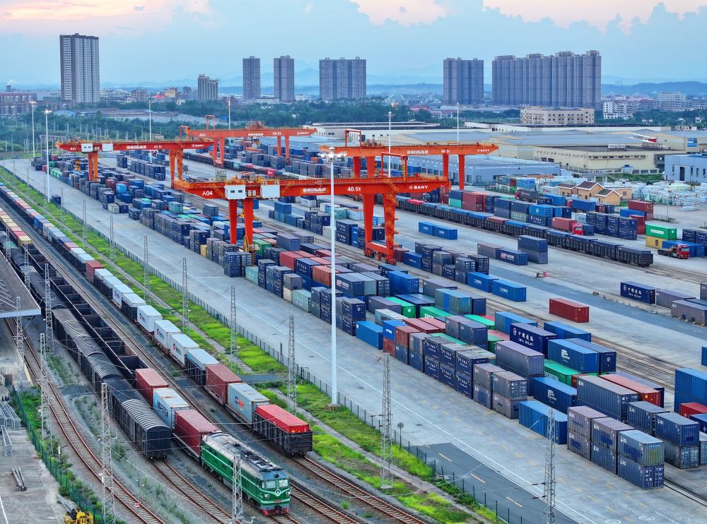 9月4日,江西省赣州市南康区赣州国际陆港货场,集装箱整齐排列,进出口货物正快速有序装卸。(受访者供图)
