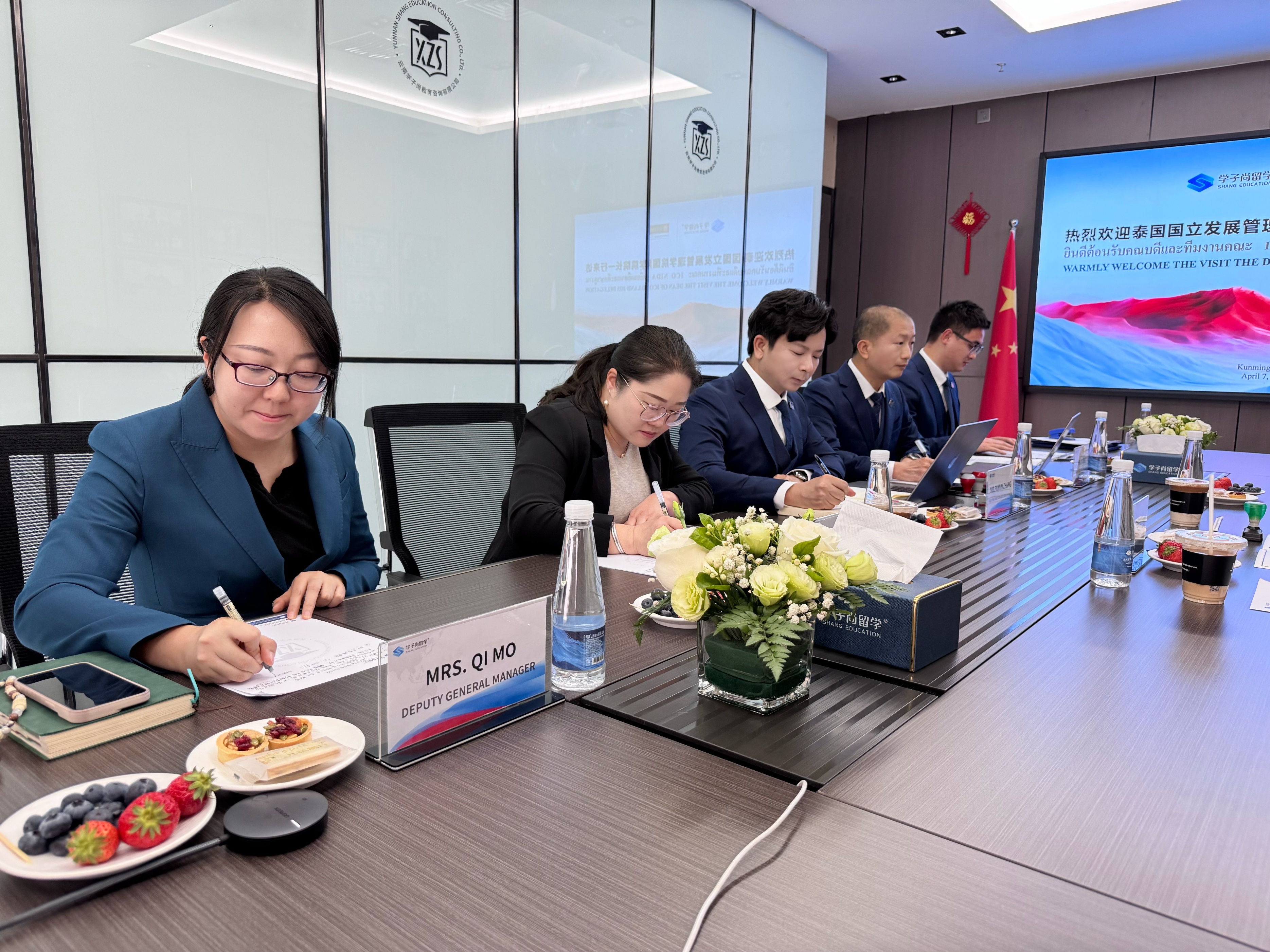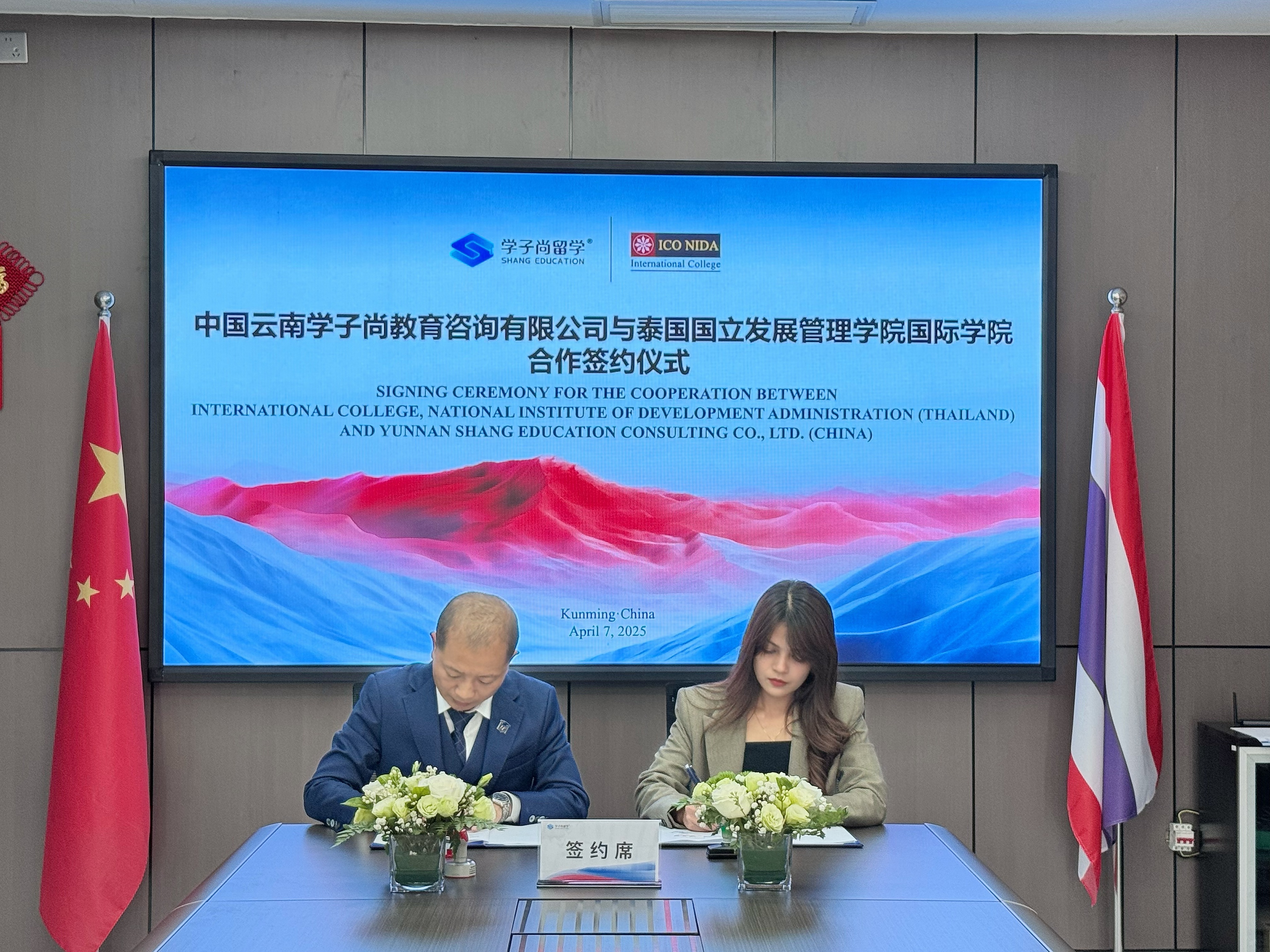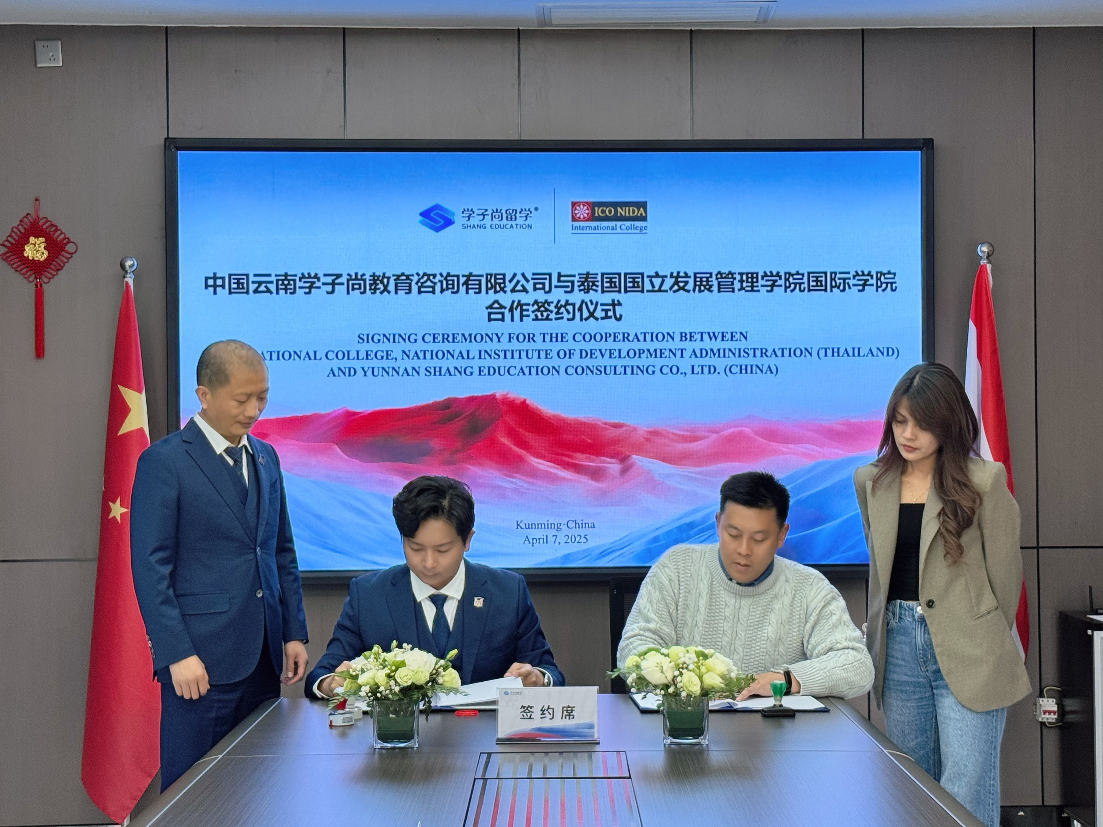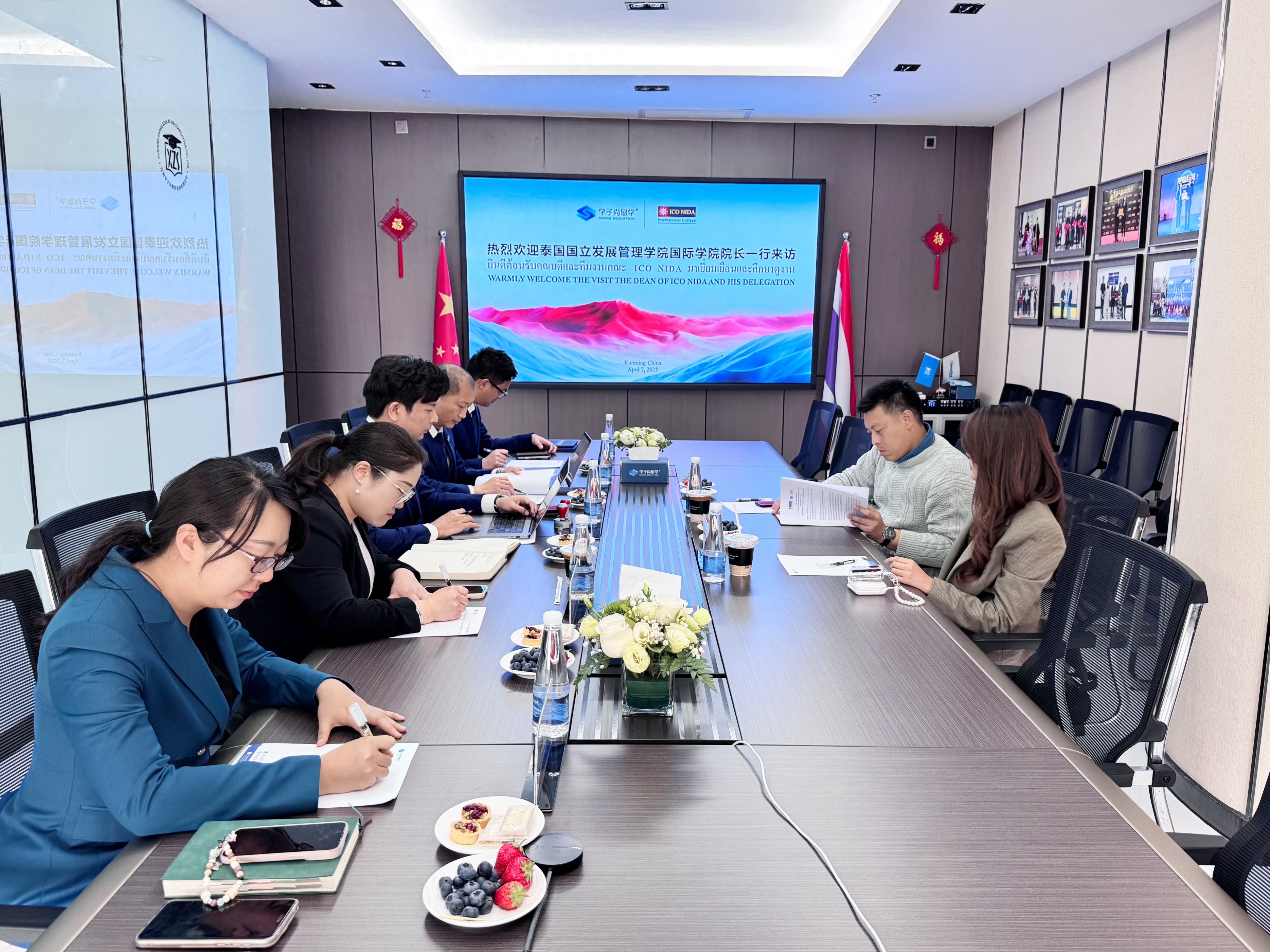 2025年4月7日,泰国国立发展管理学院国际学院(简称ICONIDA)院长Dr.SidSuntrayuth携秘书Ms.Junpen一行到访学子尚留学昆明总部,双方就深化国际教育合作展开深度交流,并正式签署ICONIDA博士集中班项目独家招生授权协议。此次合作标志着双方在国际教育合作领域开启了全新篇章,为中泰两国教育交流注入了强劲动力。学子尚留学执行董事兼总经理张濮匀,副总经理薛旭、秦绍婵、莫琪,总经理助理马浩瑜等公司管理层共同出席了本次签约仪式。
