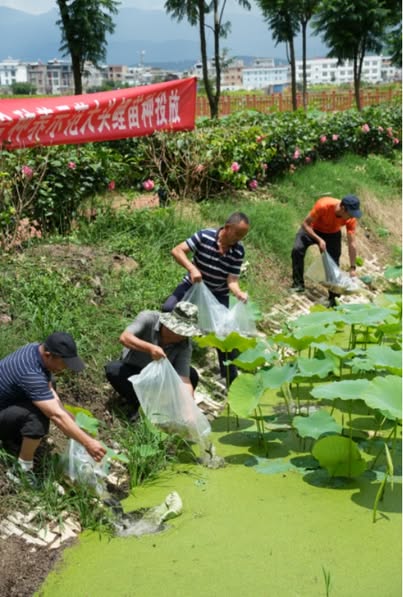 Jiangchuan, Yuxi, Yunnan, 60,000 fingerlings of Xingyun Lake’s indigenous "bighead carp" were released into rice and lotus root fields