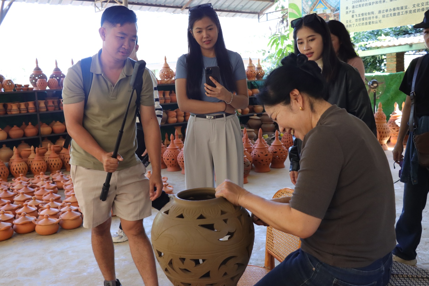 随后,达人团前往曼飞龙村寨,了解国家级非物质文化遗产“傣族慢轮制陶”。非遗传承人玉南恩现场演示制陶技艺,娓娓道来陶器背后的傣族生活智慧与信仰。Non博主表示:“这样精湛的非遗技艺不该被埋没,应该被更多人关注和了解。”达人们通过镜头记录,让非遗借助网络的力量走向更广阔的舞台。
