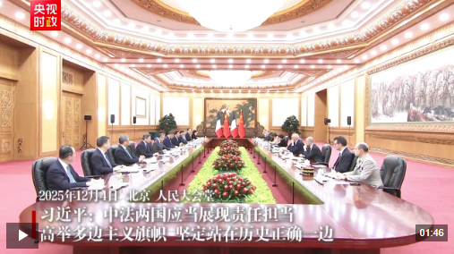 习近平主席在4日的会谈中提出殷殷期许:当前,百年变局加速演进,人类又一次站在何去何从的十字路口。中法两国应当展现责任担当,高举多边主义旗帜,坚定站在历史正确一边。