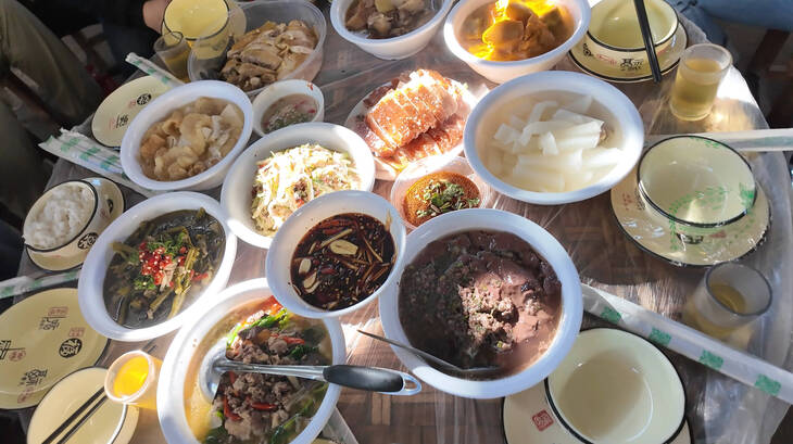 围绕这盘招牌烤猪肉,一桌融合了景颇与傣家风情的盛宴次第铺开:清凉酸辣的撒撇、软糯入味的猪皮煮萝卜、浓香醇厚的炖牛肉、嫩滑爽口的麻辣猪血……每一道都食材本真、风味鲜明,让这对缅甸博主夫妇连连赞叹,沉浸于这纯粹而热烈的边境饮食文化之中。