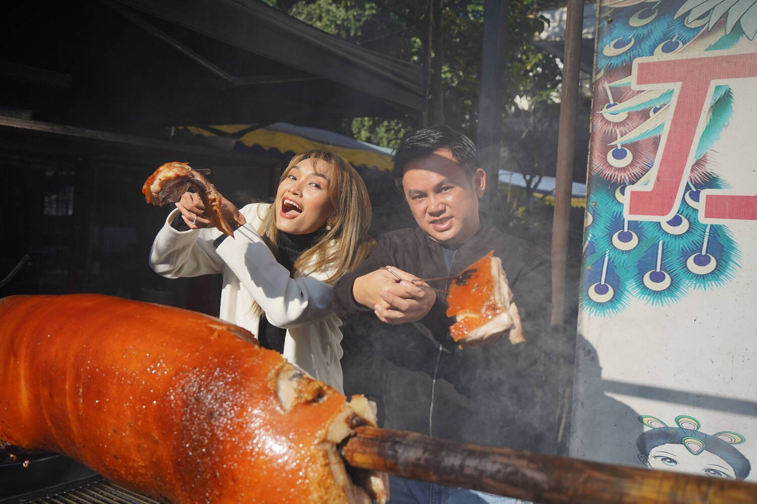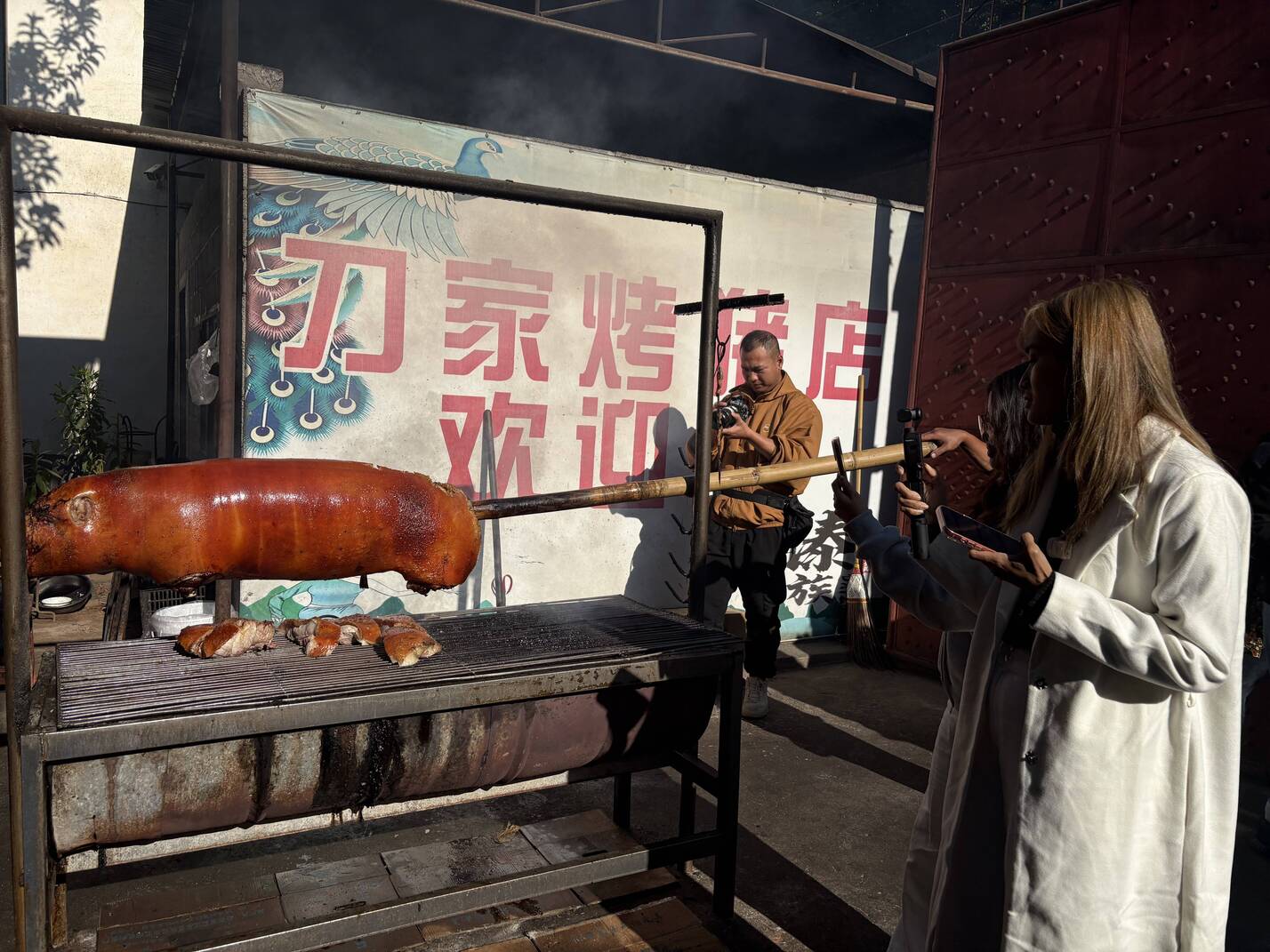 12月5日早上9点,晨雾未散,SeinPhyo和Yi的味蕾之旅便已开启。为品尝陇川地道风味,夫妇俩随团队驱车四十分钟从瑞丽赶往陇川县,目标直指那家火了十五年的“刀家烤猪肉”——这家店的烤猪每日限量,午后即售罄,不得不赶早。