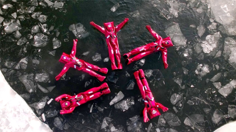 12月5日,在阿勒泰市阿苇滩镇,不少游客身着红色特制防寒服,在阿勒泰冰浮俱乐部体验冰浮项目。张福新摄