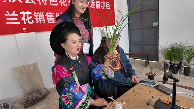 鹤庆兰花销售主播正在销售兰花(段志宇摄)
