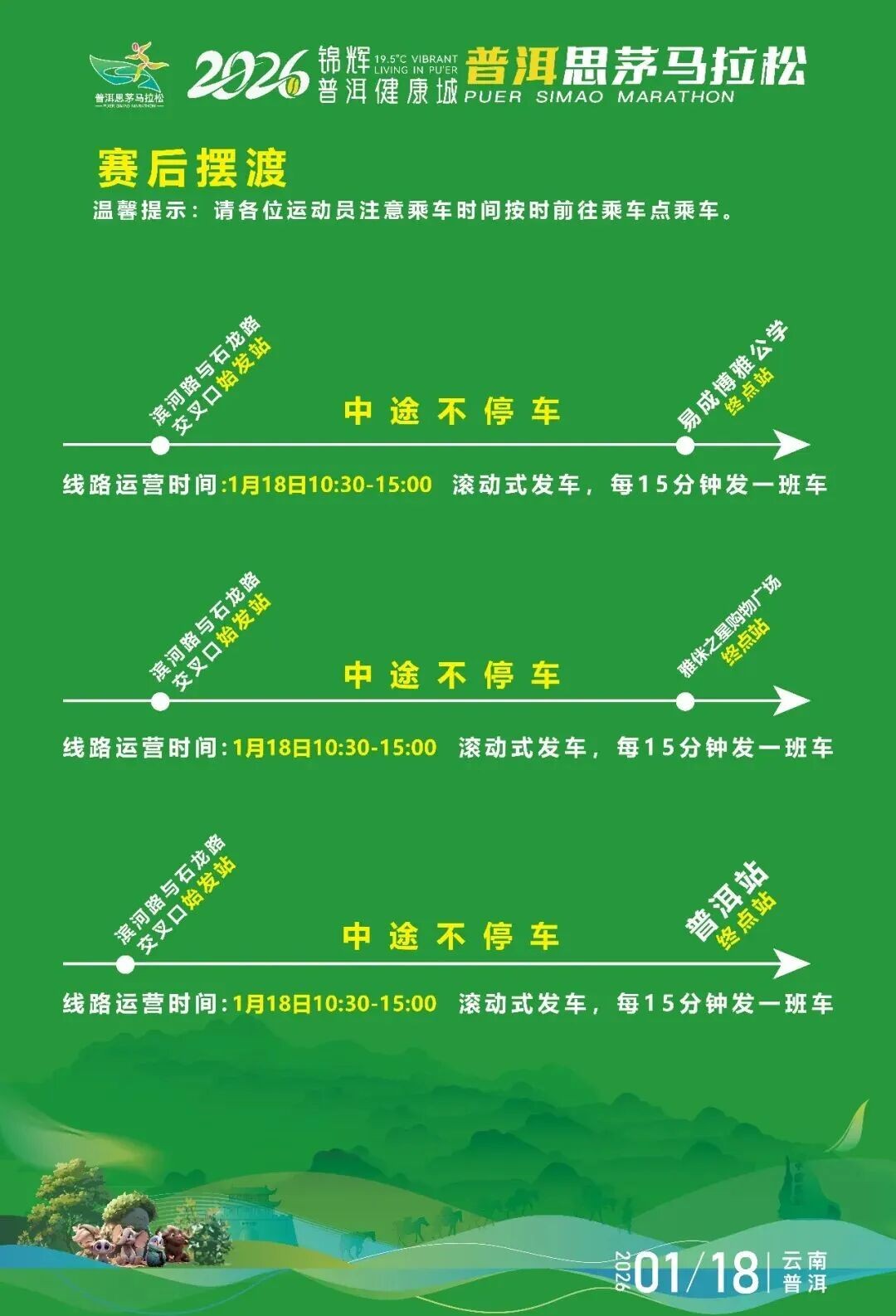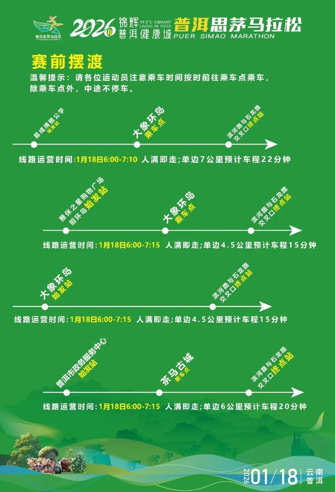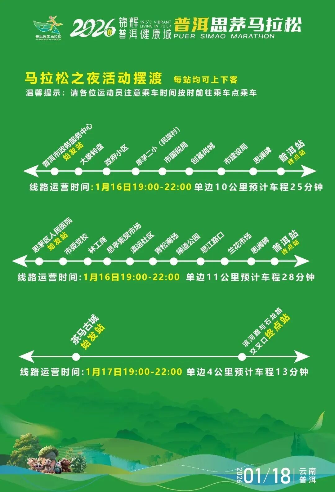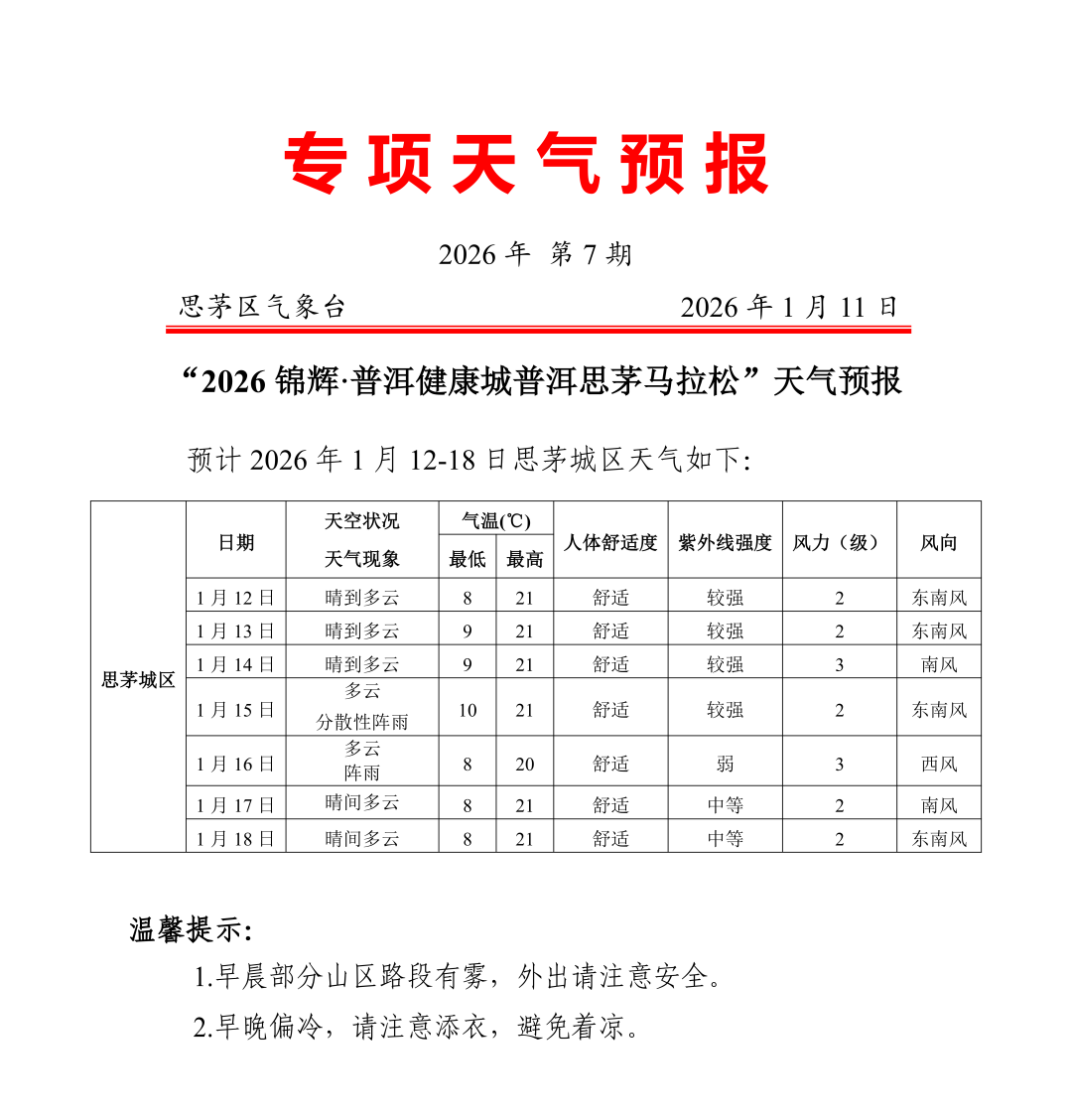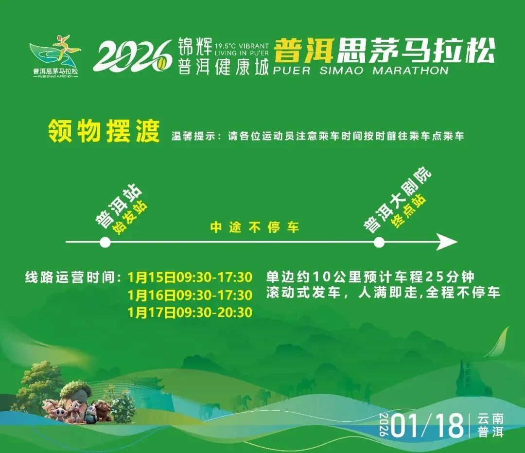 2026锦辉·普洱健康城普洱思茅马拉松将于1月18日开跑。赛事组委会向广大参赛选手发出如下文明倡议:参赛选手需身着运动服,正确佩戴号码布。请文明如厕,将参赛过程中产生的雨衣、补给包装(如纸杯、食品包装袋等),统一投入垃圾回收处。干净跑道,从我做起;健康生活,快乐运动,对兴奋剂说不!