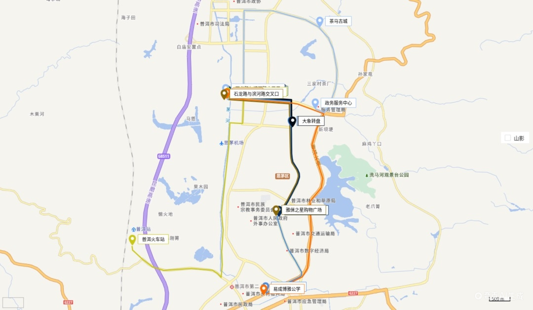 线路:普洱市政务服务中心 → 茶马古城(乘车点)→ 滨河路与石龙路交叉口