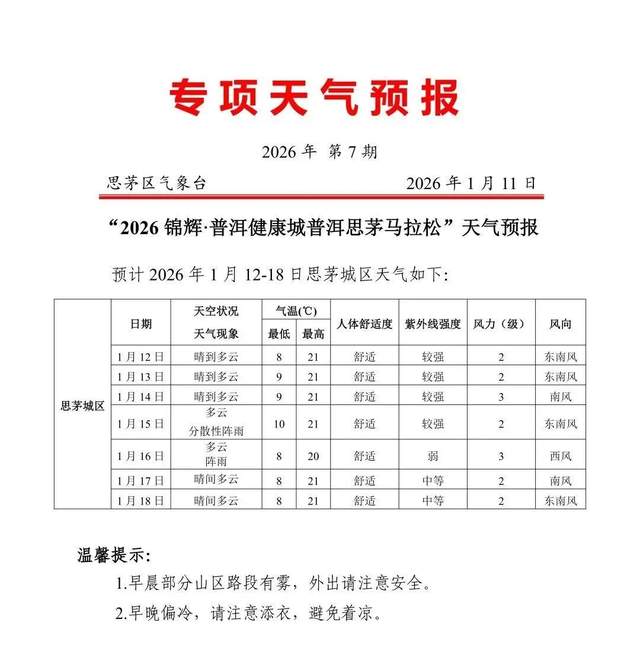 2026锦辉·普洱健康城普洱思茅马拉松将于1月18日开跑。赛事组委会向广大参赛选手发出如下文明倡议:参赛选手需身着运动服,正确佩戴号码布。请文明如厕,将参赛过程中产生的雨衣、补给包装(如纸杯、食品包装袋等),统一投入垃圾回收处。干净跑道,从我做起;健康生活,快乐运动,对兴奋剂说不!