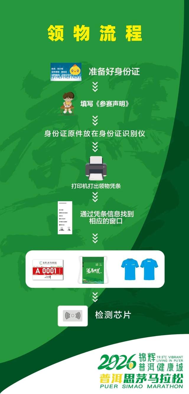 参赛选手需本人携带二代身份证原件(或报名时选择的有效证件原件)在规定领物时间内到现场领取,并现场签署《参赛声明》。