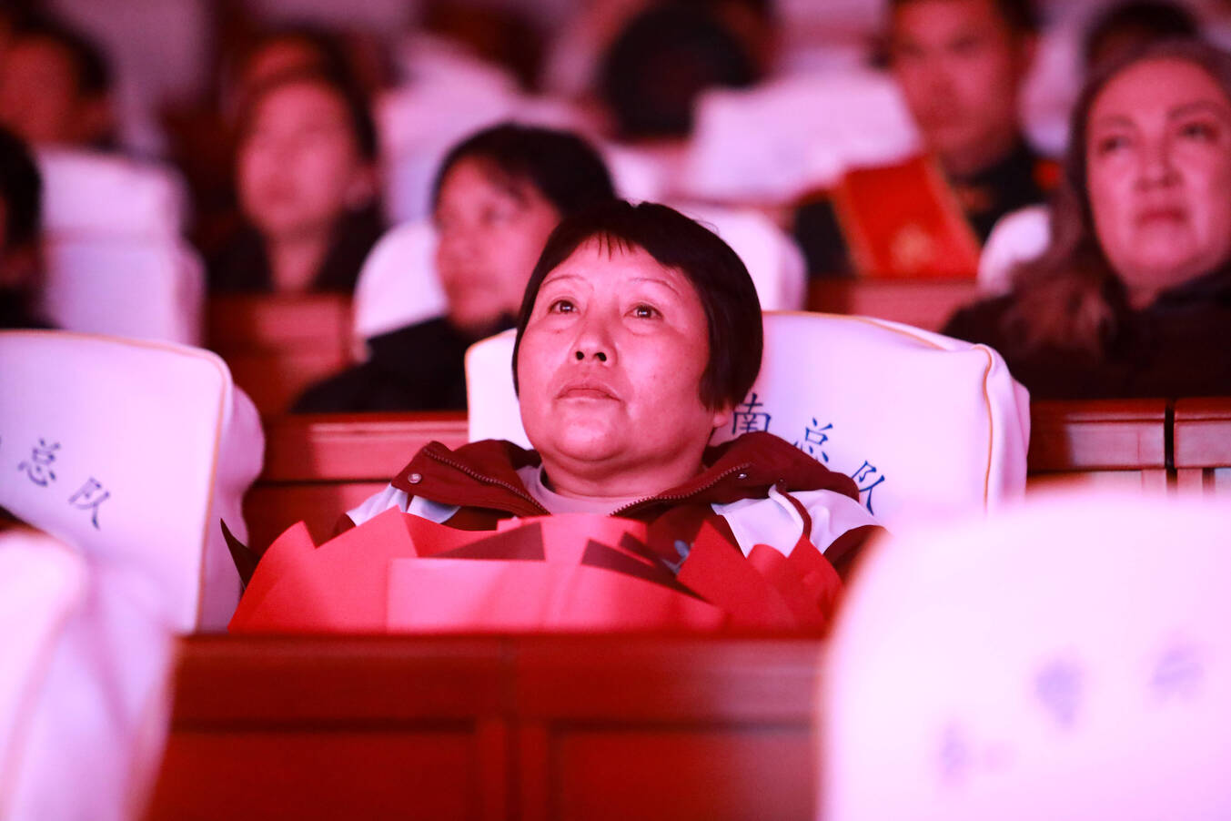 身披绶带的官兵们英姿飒爽,身旁的家属们眼含热泪、面带骄傲。聚光灯下,官兵们胸前的奖章熠熠生辉,坚毅的脸庞上洋溢着自豪与荣光。大屏幕上播放官兵们在练兵备战、维稳处突中的先进事迹时,台下家属眼含热泪、倍感欣慰。