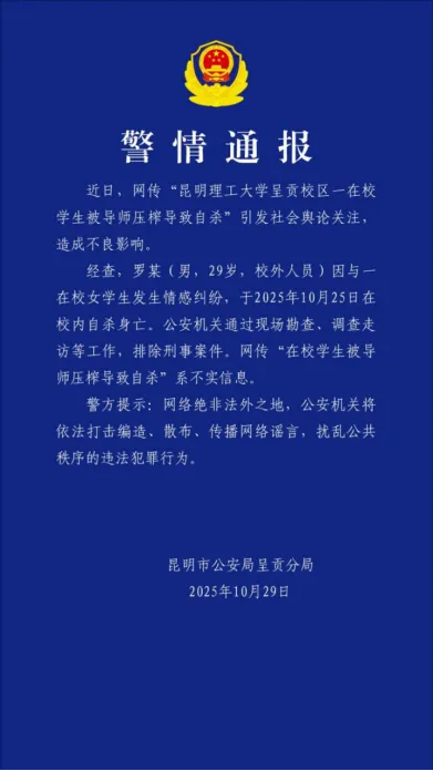 死者罗某为校外人员,因与在校女生情感纠纷自杀,排除刑事案件,与“导师压榨”无关。10月29日,昆明市公安局呈贡分局发布警情通报,掌上春城、长安街知事、中国新闻社等进行转发,有效阻断谣言传播链条。