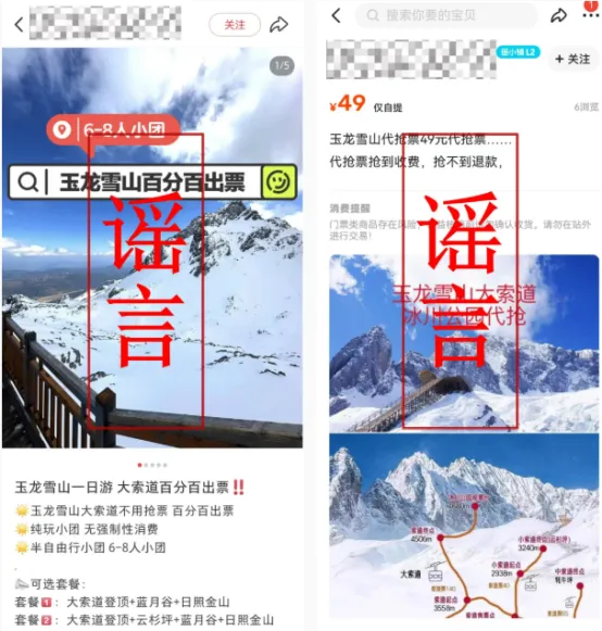 网上出现“玉龙雪山冰川公园索道票包出票”“百分百代抢”等信息,部分标注“49元代抢”“系统票”吸引游客。