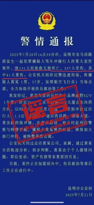 网传“昆明市金马坊路段发生驾车冲撞行人案,致131死337伤,嫌疑人被击毙”的虚假“警情通报”。