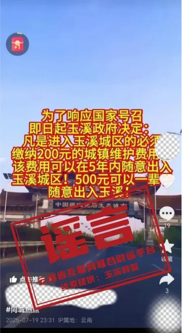 网民李某某发布视频称“玉溪市政府决定,进入城区需缴200元(5年通行)或500元(终身通行)城镇维护费”。