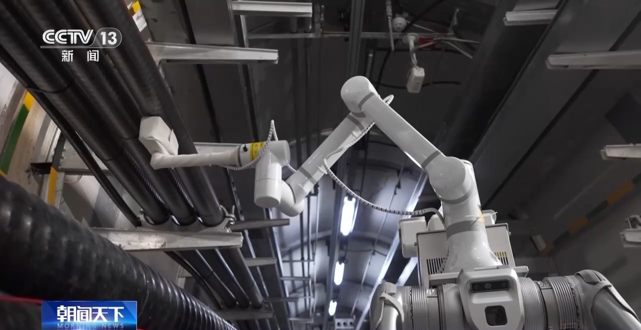 总台央视记者张艺瑾:在地下19米的电力管廊,机器狗背上长出的机械臂可以伸到电缆表面,检测出是否有放电等情况发生,大大减少电力工人在高危环境里的作业时间。