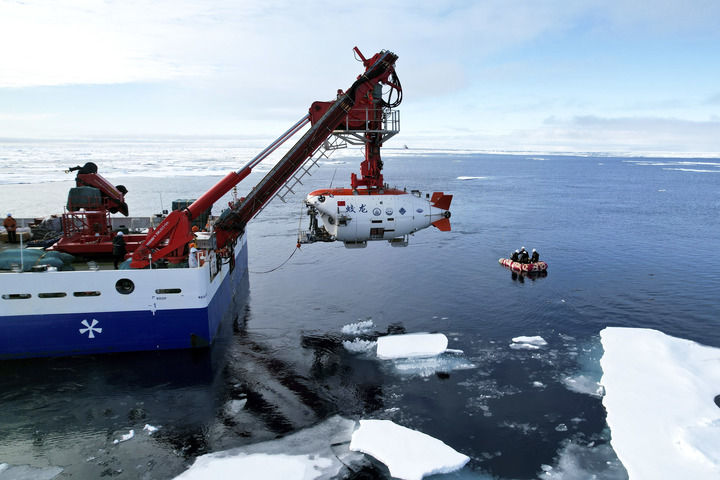 2025年8月11日,“蛟龙”号在北极冰区准备下潜。新华社记者刘诗平摄