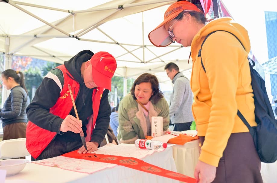 春联送福墨韵飘香,传统文化点亮年味。活动现场特设“福满新程,墨韵迎春”春联撰写区,特邀书法大师亲临助阵。他们铺展红纸、饱蘸浓墨,以笔为媒、以墨传情,凭精湛笔墨挥毫写下一幅幅寓意吉祥的春联与福字,将浓浓年味与美好期许凝于笔端、流于纸上。市民们纷纷驻足围观、交口赞叹,扫描二维码领取这份承载传统文化的新年好礼,共同迎接新的一年。