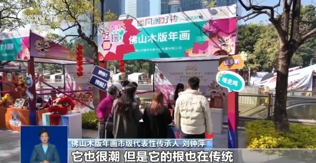 佛山木版年画市级代表性传承人刘钟萍:我们创作年画的理念叫“潮得很传统”,它也很潮,但是它的根也在传统。在摊位可以看到非常受欢迎,我们都印不停。