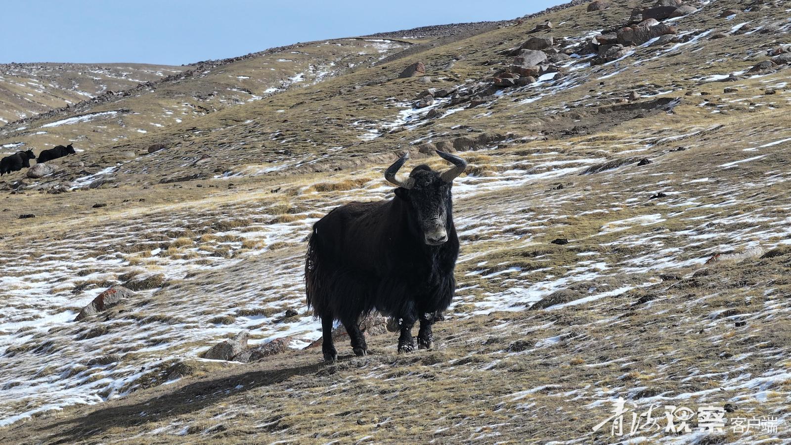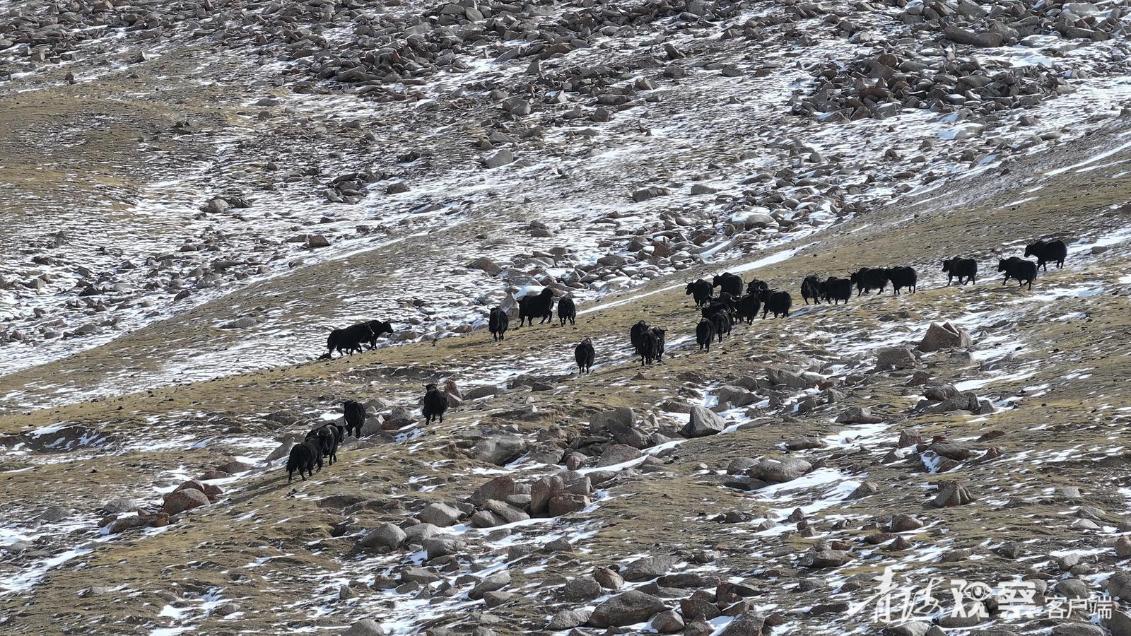 这一路遇到的野牦牛之多,连巡山队员都觉得意外:“这个季节它们通常该在海拔更低、更暖和的公路沿线或牧民冬季牧场附近。现在跑到近5000米的高山草场,可能是山下雪太厚,找不到草吃了。”