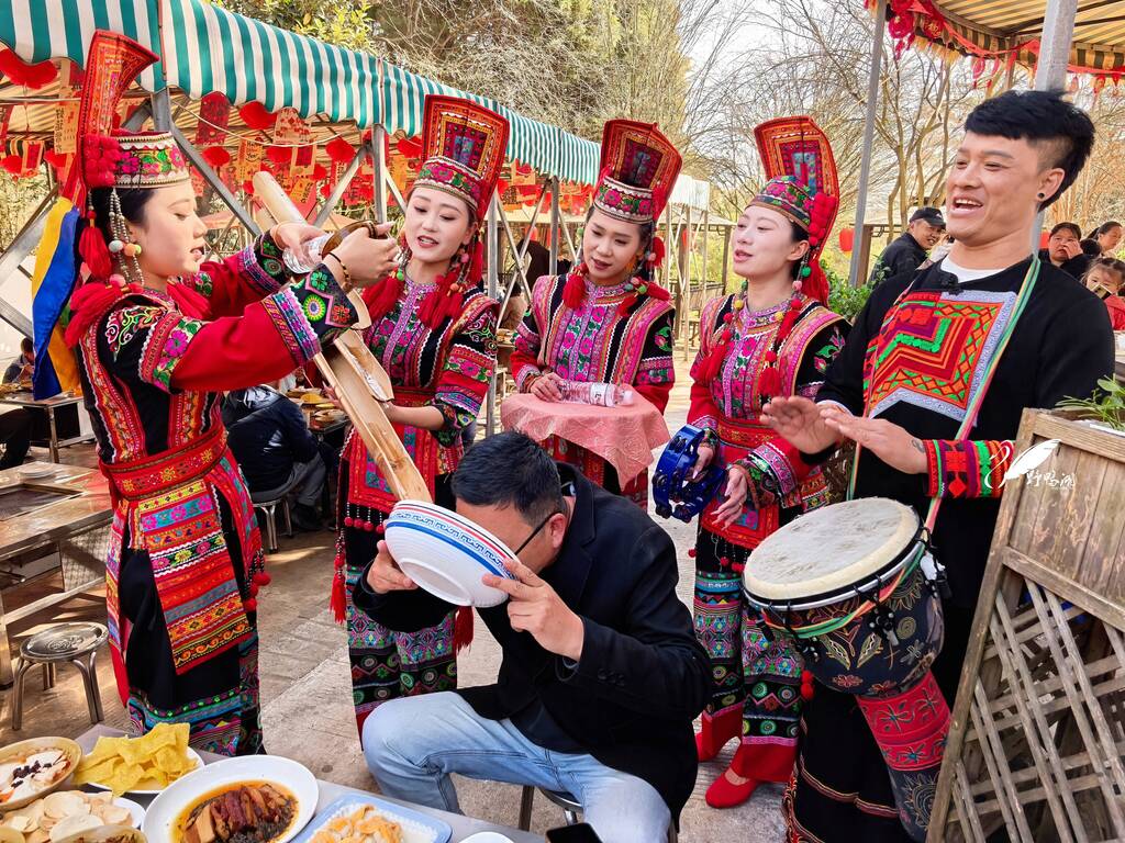 杀猪饭用餐期间,身着少数民族服饰的演员将唱响敬酒歌,带来“高山流水”“一枝独秀”等特色酒文化体验,在推杯换盏间传递质朴热情的新春祝福。