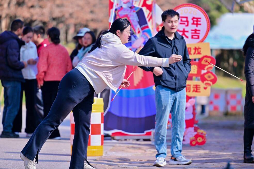 歌舞表演间隙,两大经典游园游戏趣味上线,大人小孩均可参与,获胜即可解锁多重新春好礼。猜灯谜环节涵盖马年习俗、民俗文化、新春祝福语等多元谜题,难易结合,既考验脑力又暗藏惊喜;投壶游戏设置1米、1.5米双距离,游客可比拼投掷技巧,投中数量越多福利越丰厚,无论是特色食宿权益、乡村特产,还是实用游玩套餐与现金惊喜,都能在欢声笑语中收入囊中,收获满满新春好彩头。