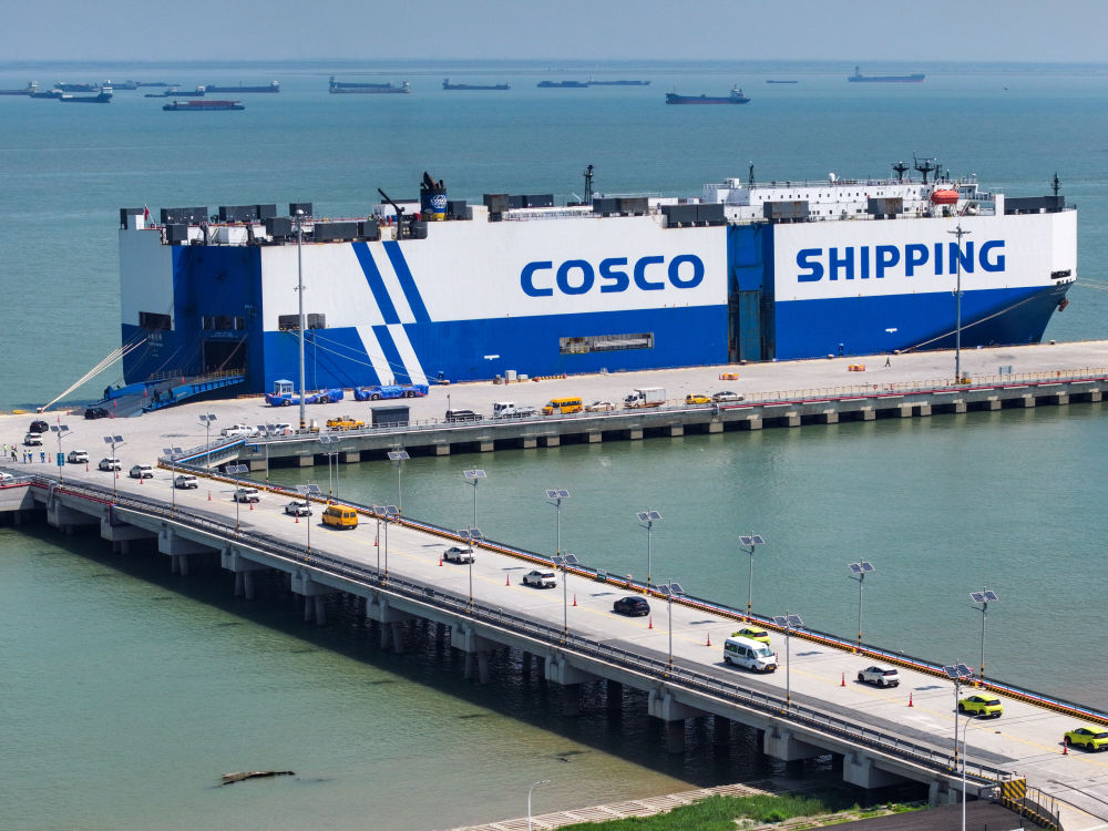 2025年9月16日,在江苏太仓港,装载3600余辆商品车的“玉衡先锋”号即将启程前往东南亚(无人机照片)。“十五五”时期