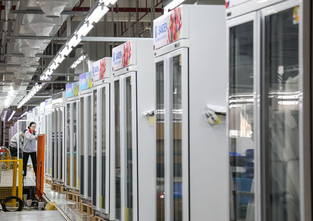 这是在西科冷链广东江门制造基地的产线上,工人对一批出口海外的商用冷柜进行外观检查(2025年3月22日摄)。![]()