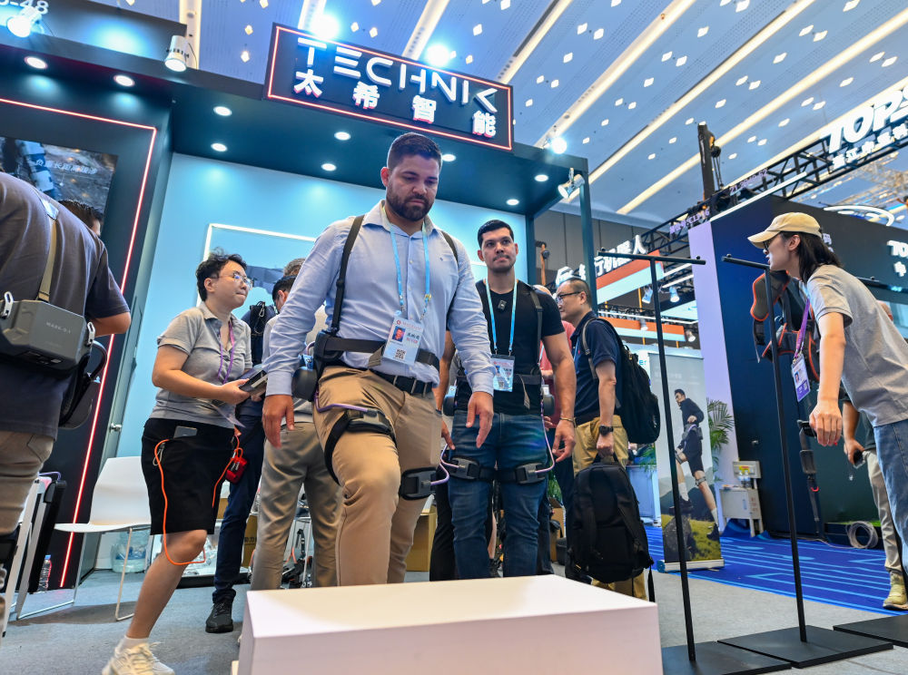 2025年10月15日,境外采购商在第138届广交会服务机器人专区太希智能展台体验登山助行外骨骼穿戴设备。![]()