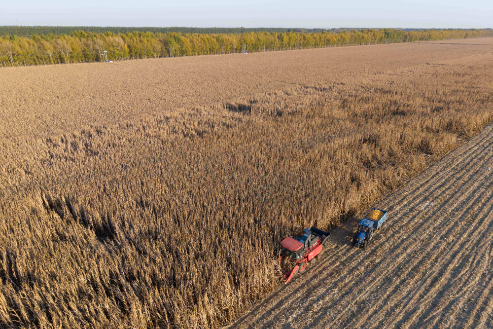 2025年10月13日,在黑龙江省肇东市五里明镇东升村应用中国农业大学肇东实验站集成“大垄双行密植+水肥一体化+秸秆粉碎深埋”技术模式的试验田里,当地农机专业合作社的农民在收获玉米(无人机照片)。![]()