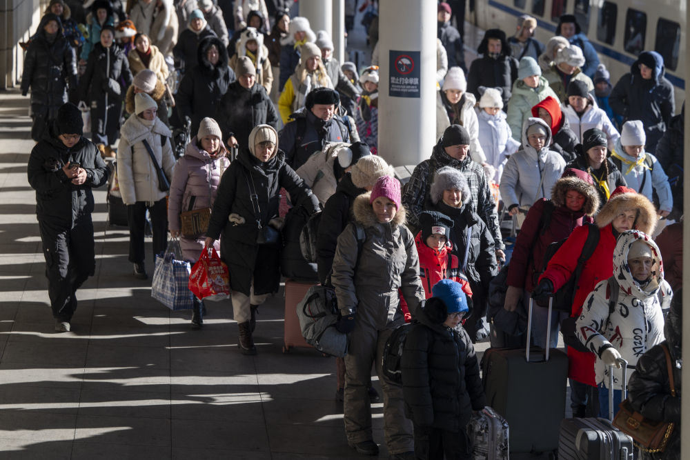 2026年1月8日,在绥芬河火车站,游客下车出站。黑龙江省绥芬河市是中俄重要陆路口岸城市。随着中俄双向免签政策实施,当地以高效便捷的通关服务提升口岸人员和贸易往来效率,带动两国人文和旅游交流。2021年至2025年