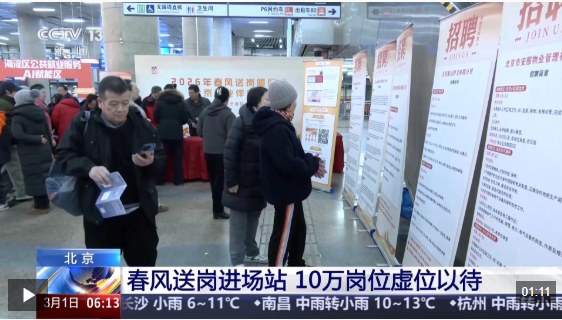 近日,北京市人力资源和社会保障局联合市重点站区管委会启动“春风送岗”公共就业服务活动,同步进驻北京西站等八大火车站以及首都、大兴两大机场,携10万个岗位直接对接进京求职者。